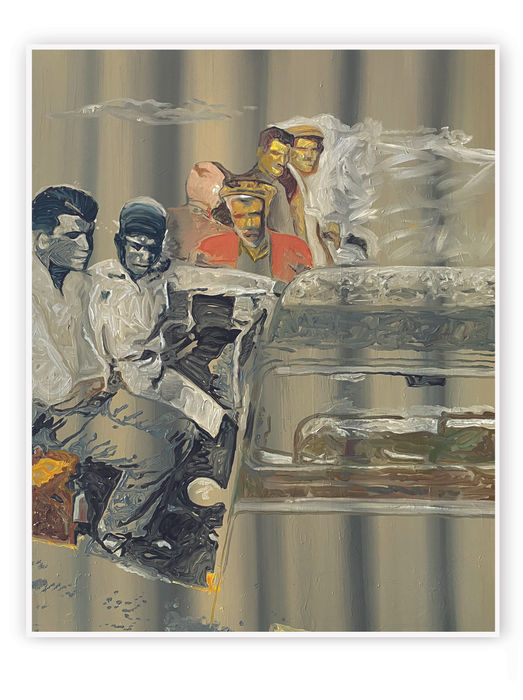 Da die dreidimensionalen Figurationen fragmentarisch bleiben, nicht vollständig ausgemalt sind, scheinen die Streifen durch diese offenen Stellen des Vordergrunds hindurch und werden so Hinter- und Vordergrund gleichzeitig. Die starre Strenge des vertikalen Hintergrunds steht in einem sich gegenseitig durchdringenden Spannungsverhältnis zur barocken Verspieltheit des Vordergrunds. Spannung als ein Schweben, ohne festen Boden unter den Füßen. Realität aus der Entfernung, die sich beim Annähern in Abstraktion auflöst, Spannung aus Schärfe und Unschärfe.