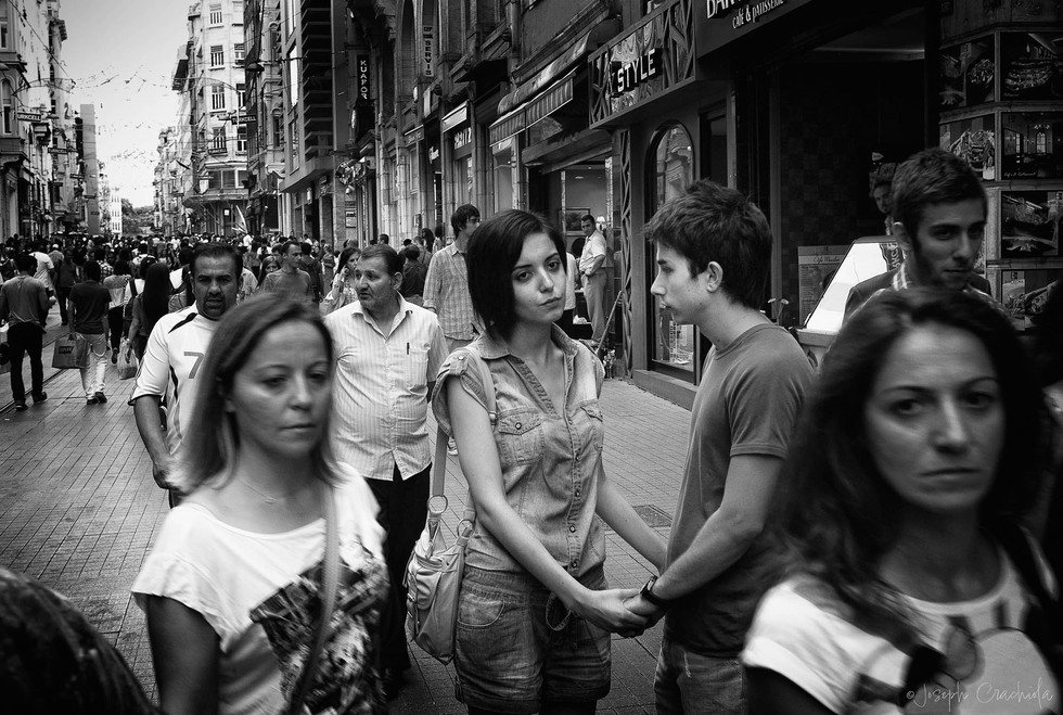 The Stillness of a Couple Amid the Crowd. Amid the rush of Istanbul, a young couple stands still — holding hands as the crowd flows around them. Their quiet tension cuts through the noise of the street. Are they in love, or on the verge of drifting apart?